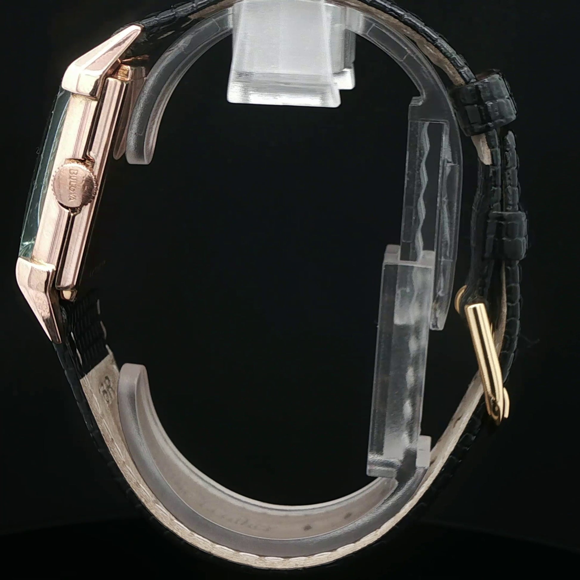 This exquisite timepiece features a 14k rose gold filled case measuring approximately 25-27mm in width, with a refined 36-38mm lug-to-lug distance that ensures comfortable wrist presence. Powered by a precision Bulova 7AK or 10BC hand-wound Swiss movement, this watch delivers reliable timekeeping through daily manual winding. The curved acrylic crystal provides classic vintage aesthetics while protecting the dial. A distinguished choice for collectors who appreciate authentic Swiss craftsmanship and the tactile engagement of mechanical watchmaking. Serial number: 6179149.